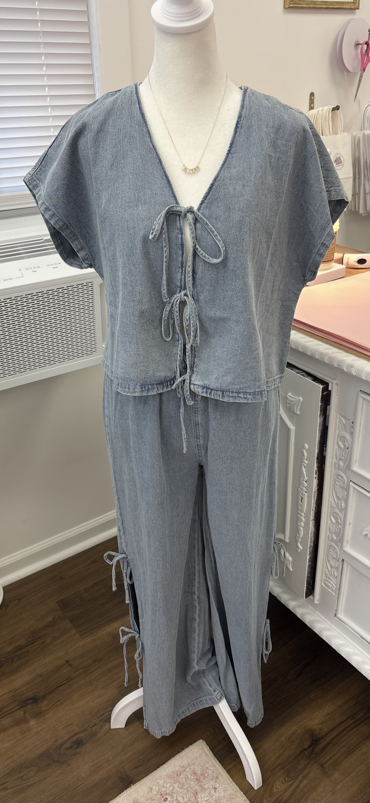 Light wash denim lace-up top
