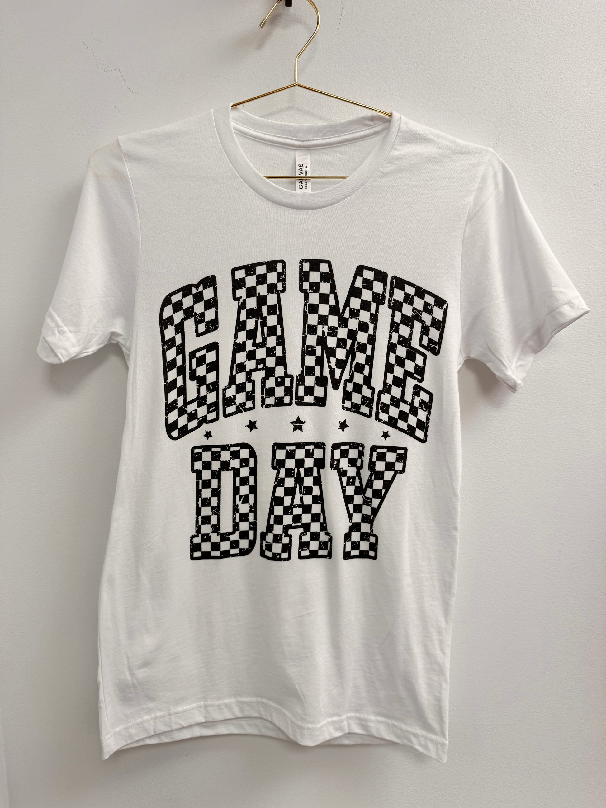 White 100% cotton t-shirt with black "Game Day" print.