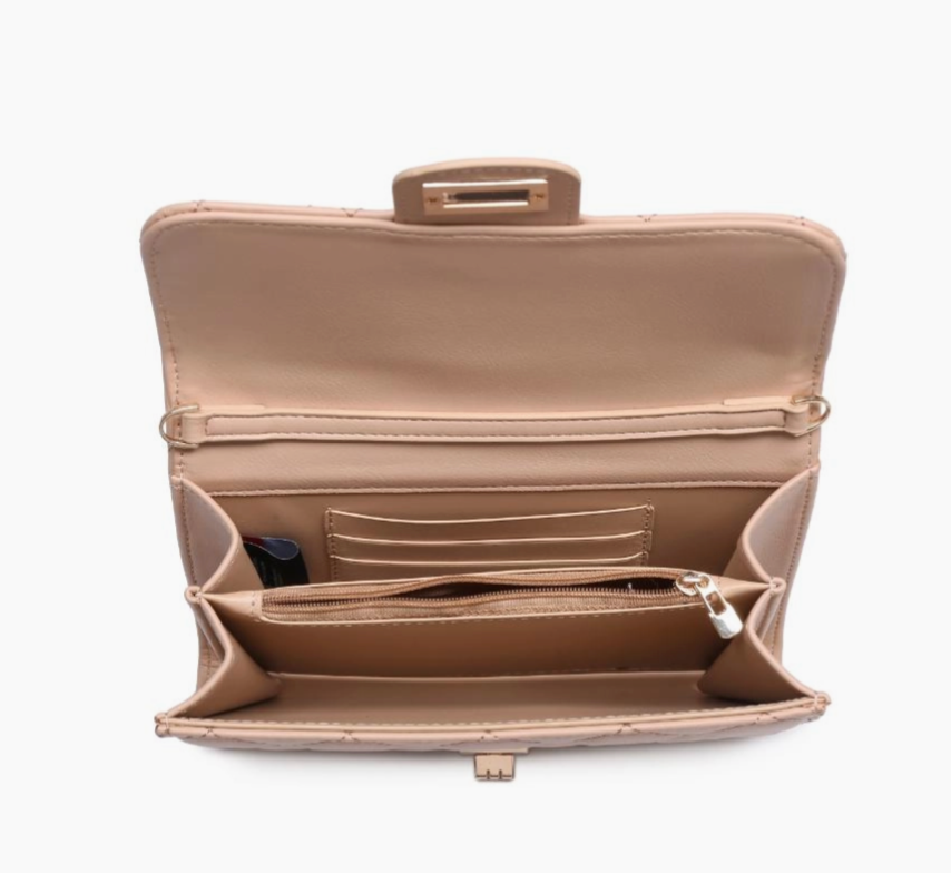Unveil the epitome of style with our Vegan Leather Crossbody, showcasing a timeless diamond-quilted design and exquisite gold hardware. The turn-lock closure secures your belongings, and the fabric-lined interior with two separate compartments, a central zip pocket, and three card slots makes it a must-have accessory for any occasion
